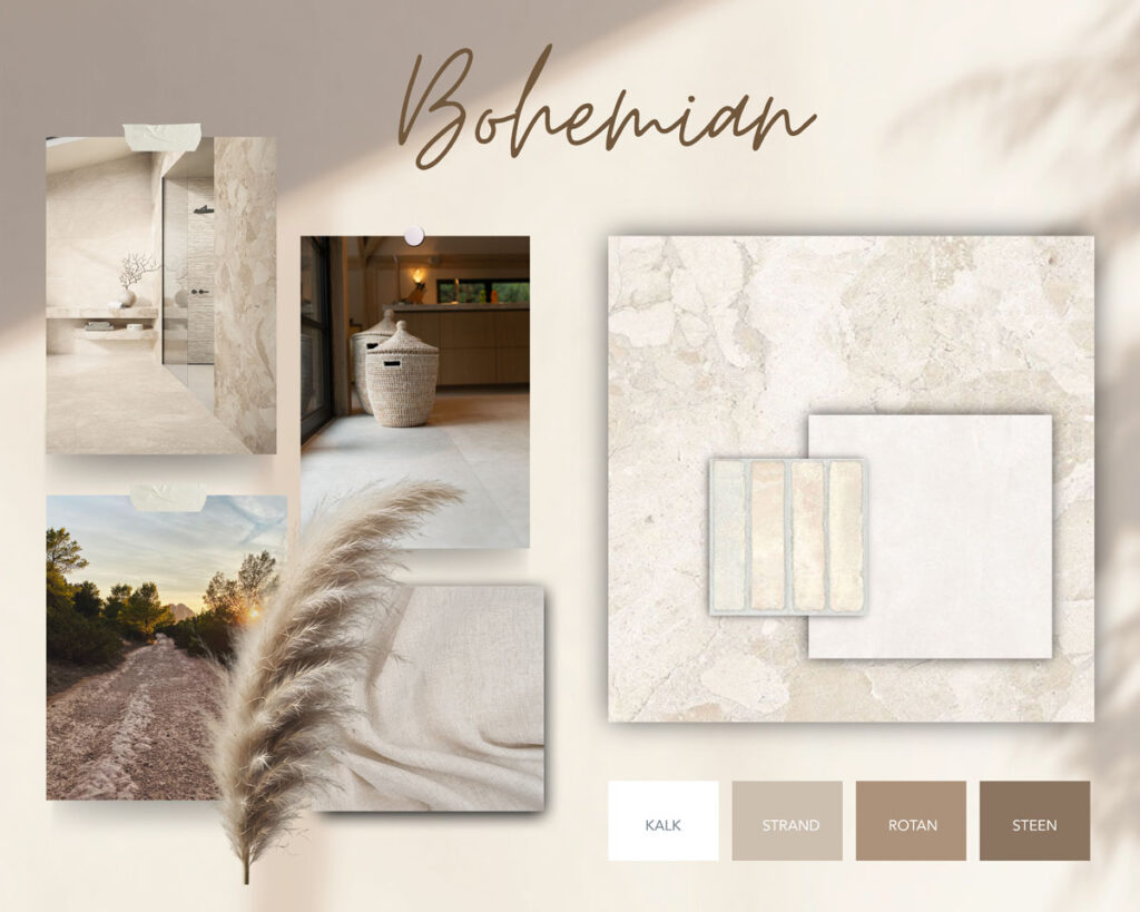 Een vleugje Ibiza, een snufje vintage en altijd die relaxte sfeer. Het Bohemian moodboard draait om textuur, gelaagdheid en contrast maar altijd zonder schreeuwerige kleuren of strakke lijnen. Denk aan verweerde houtsoorten, linnen gordijnen, rotan accessoires en natuurlijk keramische tegels die warmte en karakter toevoegen. Combineer verschillende formaten, speel met structuur en laat je gevoel het werk doen. Alles mag, zolang het maar klopt voor jou.
