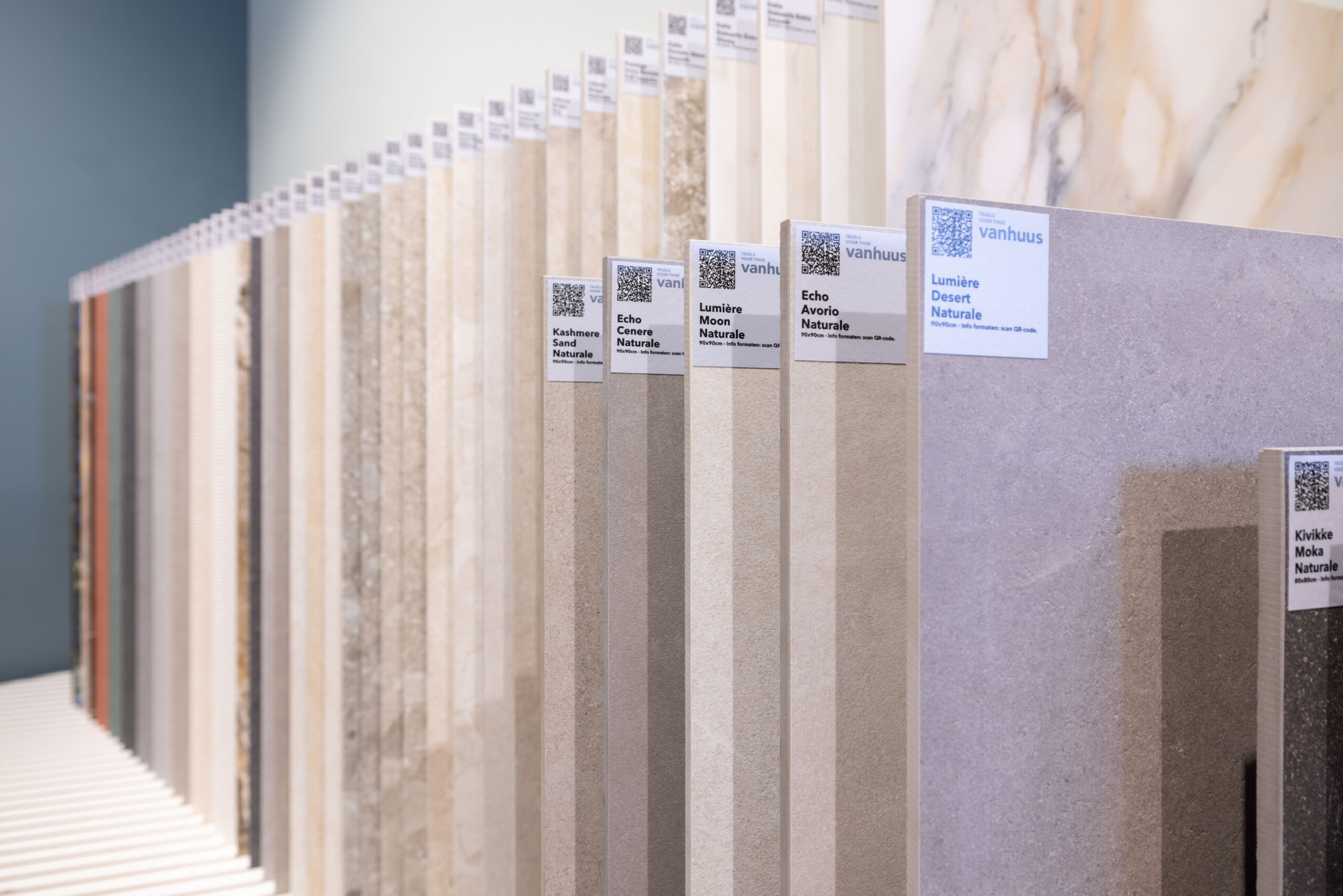 De displays zijn vernieuwd, overzichtelijker en gevuld met de nieuwste keramische tegels uit onze collectie. Grote formaten en een doordachte presentatie zorgen ervoor dat je makkelijker kunt kiezen, vergelijken én voelen wat past bij jouw stijl. Een praktische en stijlvolle presentatie die precies laat zien wat Vanhuus uniek maakt.